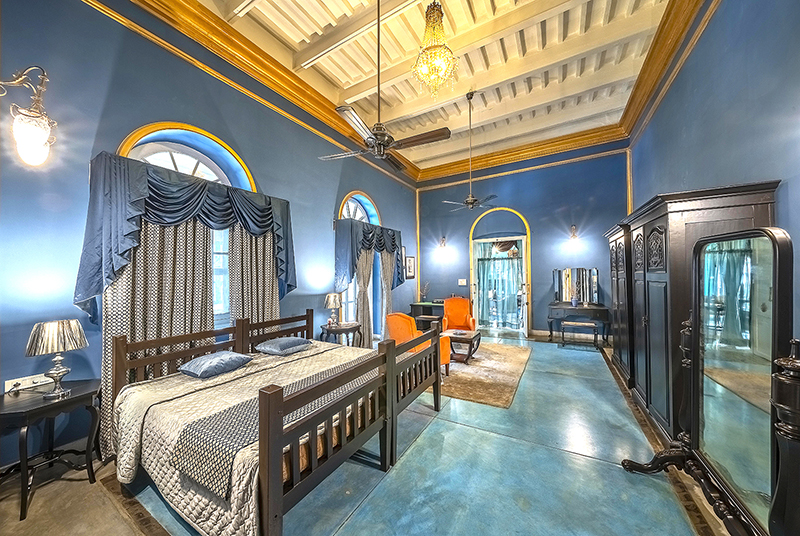 The rooms have carefully curated bookshelves with a few memorabilia of the bygone era that include ink pots, fountain pens and old school lanterns. The lush velvet curtains, rugs and carpets from Kashmir add a dash to the grandiosity.